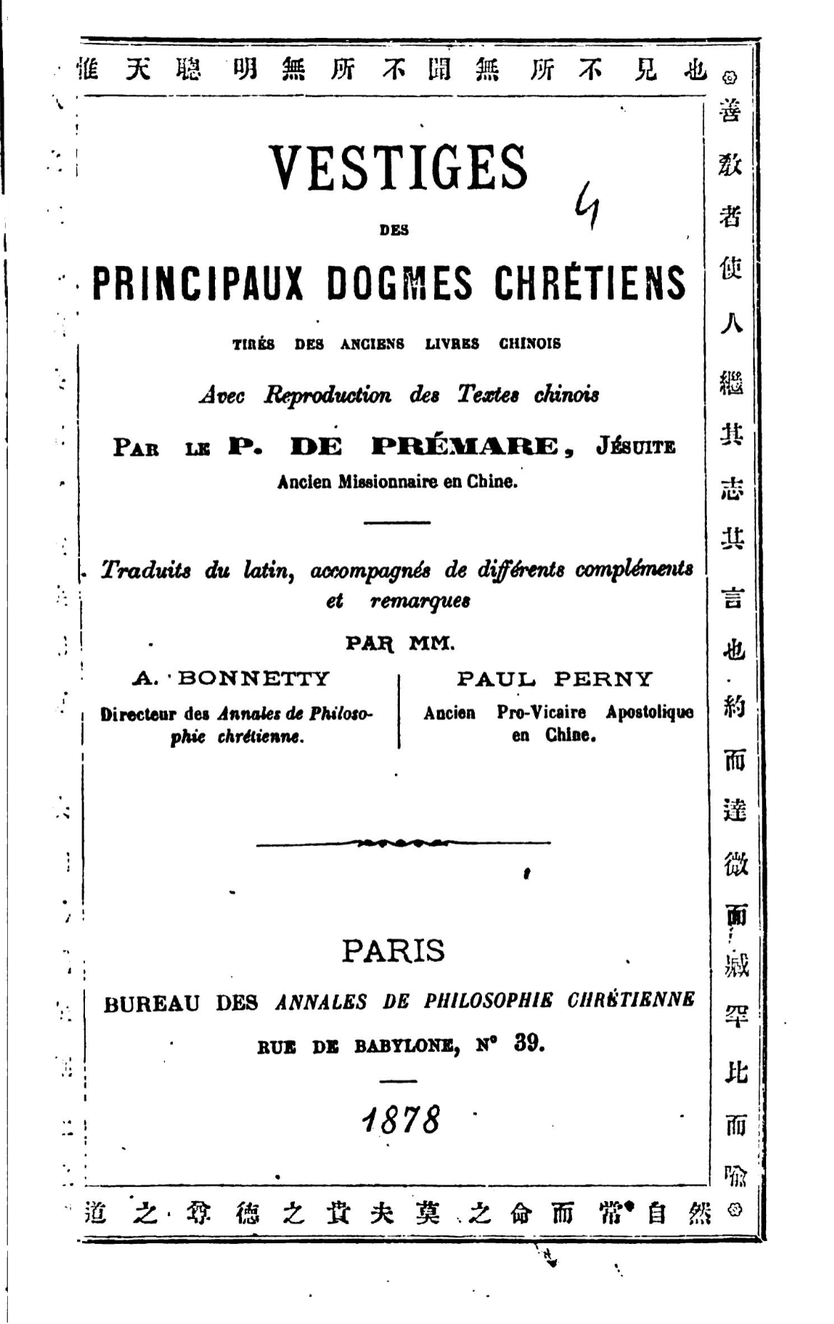 Donde pode vir uma tal resistência? Salvo engano, por acaso não se pode dizer que ela vem em grande parte do abuso de graças? Filha de Noé como todas as outras nações, a China, afastando-se do berço primitivo durante a duração dos séculos, levara consigo as tradições paternas. Em vez de conservá-las intactas, ela as alterou consideravelmente, como um filho pródigo. Contudo, um fato que hoje é posto em evidência: seus antigos livros conservam vestígios em grande número das revelações bíblicas, do Antigo ou do Novo Testamento. A respeito disso, recomendamos a instrutiva obra do padre Prémare, recentemente publicada em Annales de Philosophie Chrétienne, de M. Bounetoy.