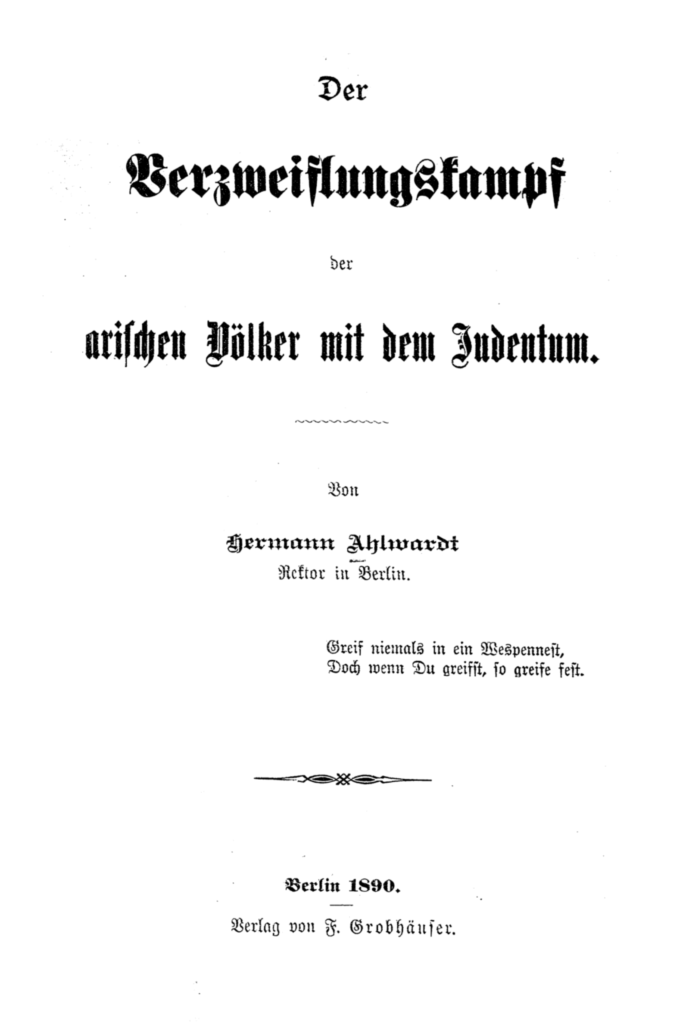 Na Alemanha, a situação chegou a tal ponto que, em setembro, o Sr. [Hermann] Ahlwardt pôde publicar em Berlim seu livro Der Verzweiflungskampf der arischen Völker mit dem Judentum (“A Luta Desesperada dos Povos Arianos contra o Judaísmo”), repleto de provas tão aterradoras que o governo julgou necessário confiscar o livro.