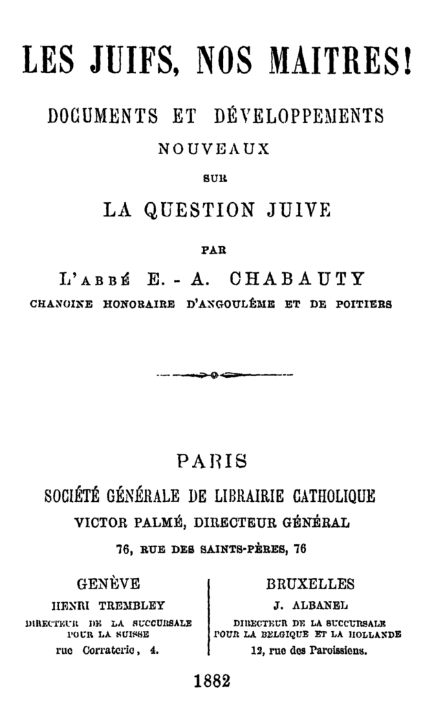 Aquela série de afirmações que, em 1789, foi proclamada como sendo a síntese dos direitos do homem, na realidade nada mais representava senão os direitos dos judeus, em detrimento dos povos no seio dos quais se pretendeu implantar a prática desses direitos. Tais direitos foram, por assim dizer, o baluarte de poder mediante o qual, em nosso século, o judaísmo cercou a sociedade cristã, assaltou-a, transtornou-a e, em grande parte, sobrepujou-a. Isso se vê no estupor universal em que se encontra a Europa ao perceber que o ouro, a difusão das ideias e a orientação político-irreligiosa dos seus Estados estão quase inteiramente em mãos hebraicas. Tanto assim que o Padre Chabauty pôde, sem contestação de ninguém, publicar um livro intitulado Les juifs, nos maîtres! (“Os Judeus, Nossos Senhores!”).