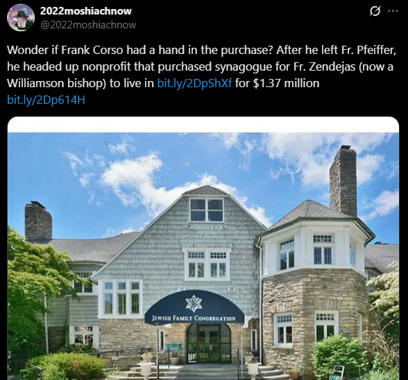 “Será que Frank Corso teve algo a ver com a compra? Depois que ele se afastou do Pe. Pfeiffer, ele passou a liderar a organização sem fins lucrativos que comprou uma sinagoga para o Pe. Zendejas (hoje um bispo de Williamson) morar, por 1,37 milhão de dólares.”