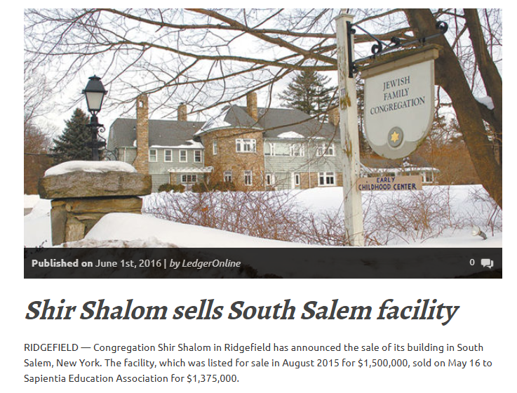“RIDGEFIELD — A Congregation Shir Shalom, de Ridgefield, anunciou a venda de seu prédio em South Salem, Nova York.