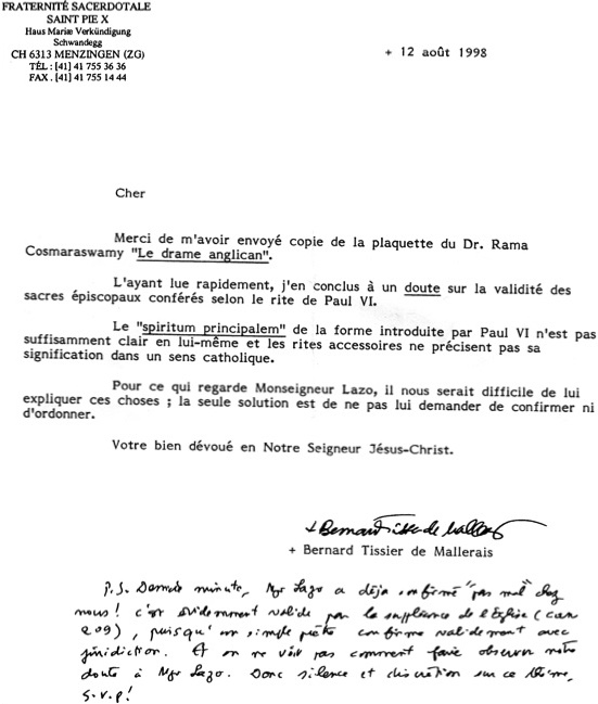 Alguém encaminhou o estudo do Dr. Coomaraswamy a Dom Bernard Tissier de Mallerais, que residia então na sede da FSSPX em Menzingen, Suíça. Numa carta de 12 de agosto de 1998, o bispo respondeu: