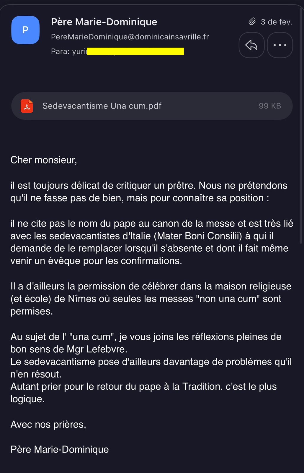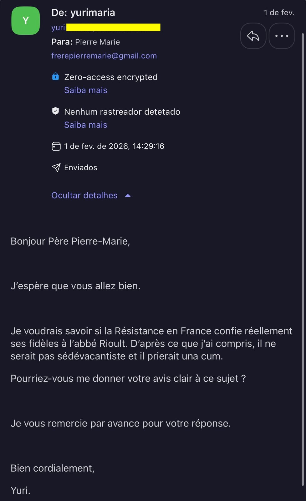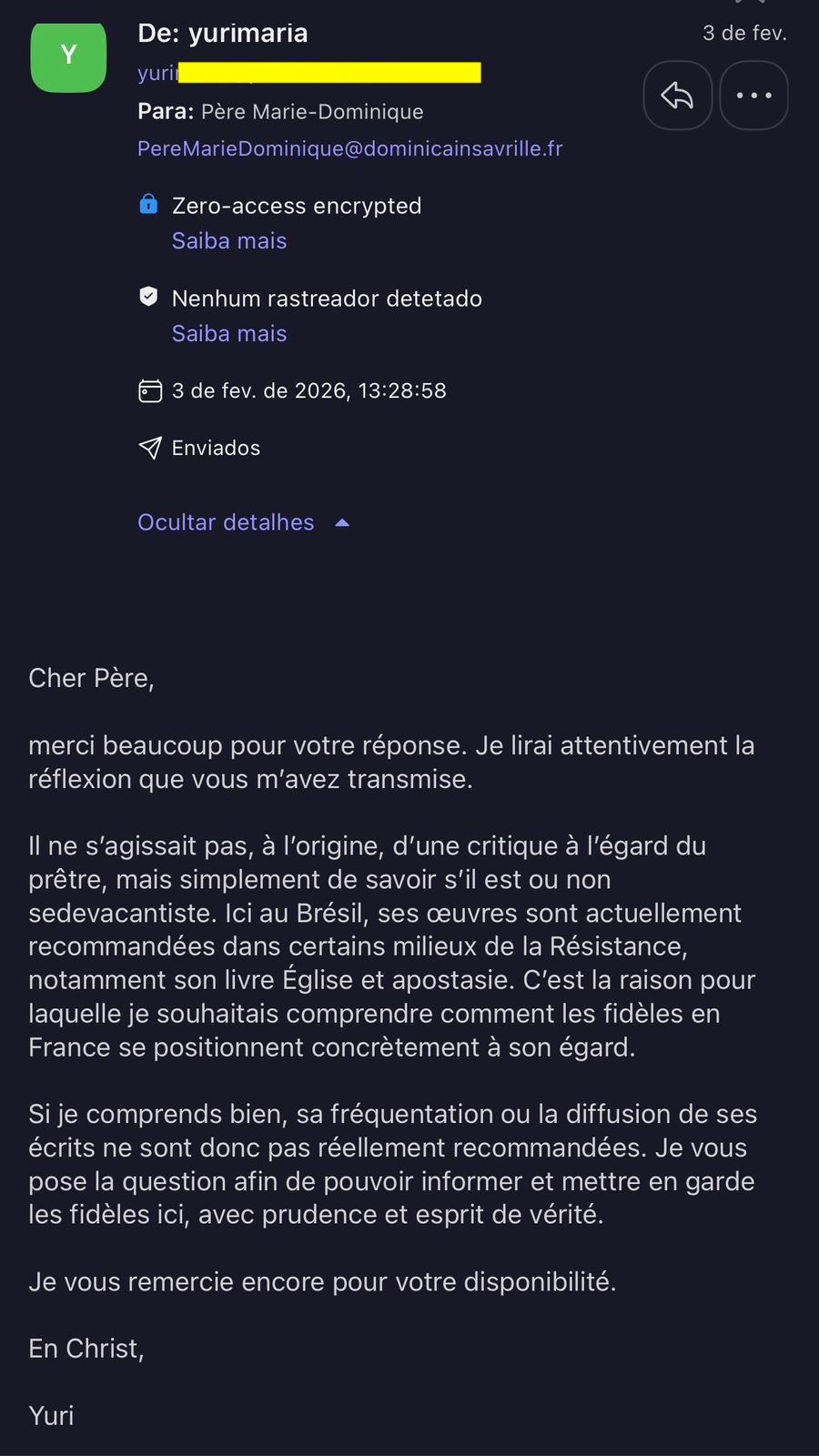 Para não haver mais dúvidas ou suspeitas quanto à nossa publicação anterior, reproduzimos aqui os prints cedidos gentilmente pelo sr. Yuri Maria de sua troca de e-mails com Frei Marie-Dominique, dos Dominicanos de Avrillé, na qual o clérigo francês confirma que Padre Olivier Rioult é sedevacantista.