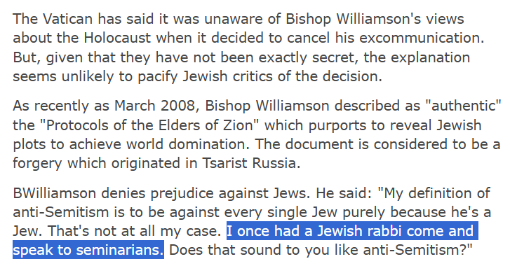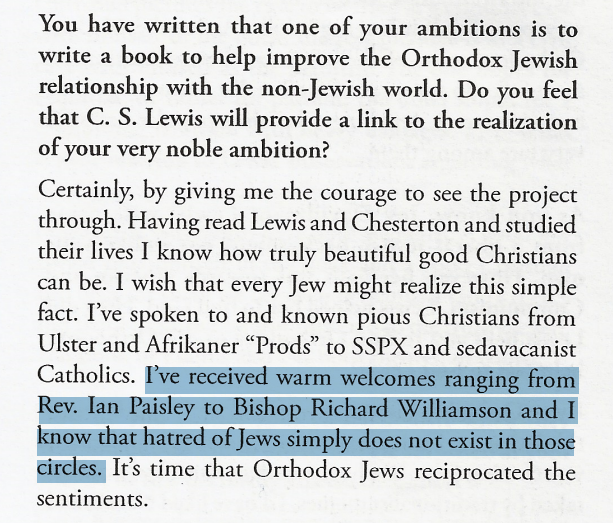 “Fui recebido calorosamente por pessoas que vão do Rev. Ian Paisley ao bispo Richard Williamson, e sei que o ódio aos judeus simplesmente não existe nesses círculos.”