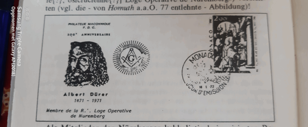 O que Homuth provavelmente não sabia, pelo menos não o mencionou: seu informante é aparentemente idêntico ao arquivista secreto Br.'. Dr. Ludwig Keller em Charlottenburg-Berlim, que o maçom de alto nível Karl Heise citou em 1920 como autor de vários livros sobre a história da Maçonaria publicados entre 1903 e 1911, embora estejamos menos interessados nessas obras posteriores de Keller do que no seu estatuto de “grão-mestre designado alemão”, tal como atestado pelo seu irmão de loja Heise.[8] Como grão-mestre da “nobre” corporação dos pedreiros livres, Keller deveria estar tão bem informado sobre o que era a Loja de Nuremberg, que já florescia por volta de 1500, como os irmãos maçônicos que, numa capa de primeiro dia no Mónaco, em 1971, em nome da “Philatélie maçonique F.D.C.”, publicaram Albrecht Dürer (nascido há 500 anos) com o típico sinal de “olhar” dos “iniciados”,[9] como “Membro da R.'. (Real?) (Rosacruz?) Loja Operativa de Nuremberg” (“Membre de la R.'. Loge Operative de Nuremberg”). Veja abaixo a imagem da página 77 da op. cit. de Homuth: