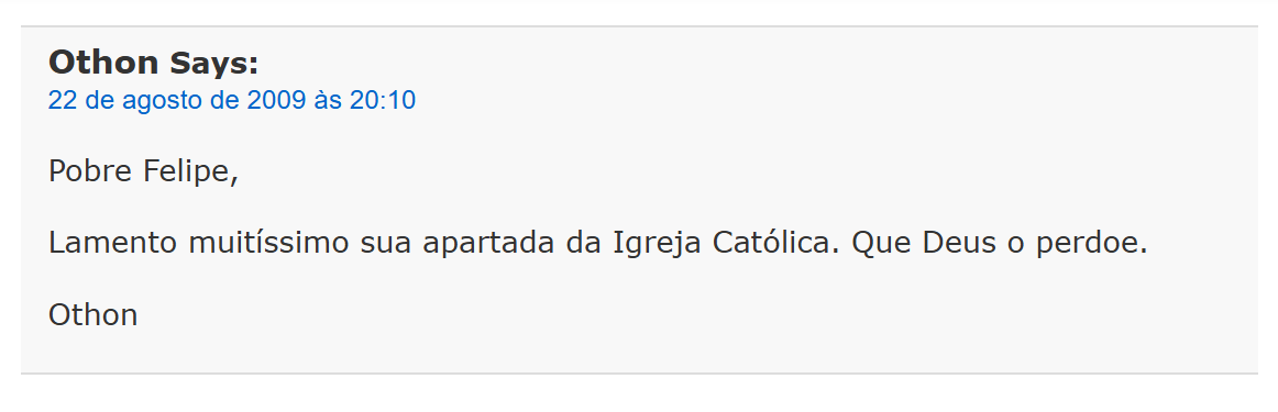 22 de agosto de 2009 às 20:10 Pobre Felipe, lamento muitíssimo sua apartada da Igreja Católica. Que Deus o perdoe. Othon. - N. B. Guarinelo Says: