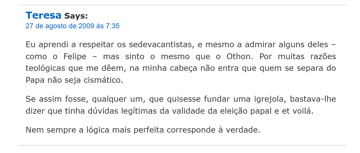 28 de agosto de 2009 às 21:42 Prezada Teresa, salve Maria. O seu paralelo não colhe, e por mais de uma razão. Alguém “dizer que tinha dúvidas legítimas etc.”, quando na verdade não as tinha mas apenas buscava um pretexto para se livrar de um Papa legítimo, não exime essa pessoa de cisma, pois para isso é preciso que: (a) essas dúvidas existam de fato na mente do indivíduo e (b) tenham fundamento real nos fatos. Quanto ao (a): as suas próprias palavras impugnam o paralelo que a Srta. faz entre os dois casos, pois, quando você admite que um sedevacantista pode ser uma pessoa respeitável, deixa assim patente que, mesmo a seus olhos, o questionamento da reivindicação ao papado de Montini-Wojtyla-Ratzinger não tem qualquer semelhança com um pretexto sem base e forjado por “qualquer um, que quisesse fundar uma igrejola” (ou seja, uma pessoa indigna de respeito, quanto mais de admiração), como você diz. Ademais, nenhum sedevacantista aqui está “fundando uma igrejola”. Os chamados “conclavistas” são uma minoria ínfima e nada representativa dos sedevacantistas: basta olhar os números. Quanto ao (b): O próprio fato de um Dom Lefebvre ter cogitado seriamente se a Santa Sé não estaria vaga e de Dom Mayer, ao que tudo indica, ter ido ainda além, mostra claramente que existe, sim, fundamento, no mínimo, para “dúvidas solidamente fundamentadas [‘probabiliter’]”, nas palavras daquele que Santo Afonso considerava o maior teólogo desde Santo Tomás de Aquino: “Tampouco é alguém um cismático por negar a sua sujeição ao Pontífice com base em ter dúvidas solidamente fundamentadas [‘probabiliter’] concernentes à legitimidade da eleição dele ou do poder dele [referências a Sanchez e Palao].” (DE LUGO, Disputationes Scholasticae et Morales, De Virtute Fidei Divinae, disp. xxv, sect. iii, nn. 35-8). (Para cf. a cit. no original: clique aqui). Isso já basta para provar que os sedevacantistas não cometem o pecado ou crime de cisma só por serem sedevacantistas. E, finalmente, você deveria considerar ainda a possibilidade bastante real de um derradeiro motivo para os sedevacantistas não serem cismáticos: Bento XVI não ser Papa. Atenciosamente,