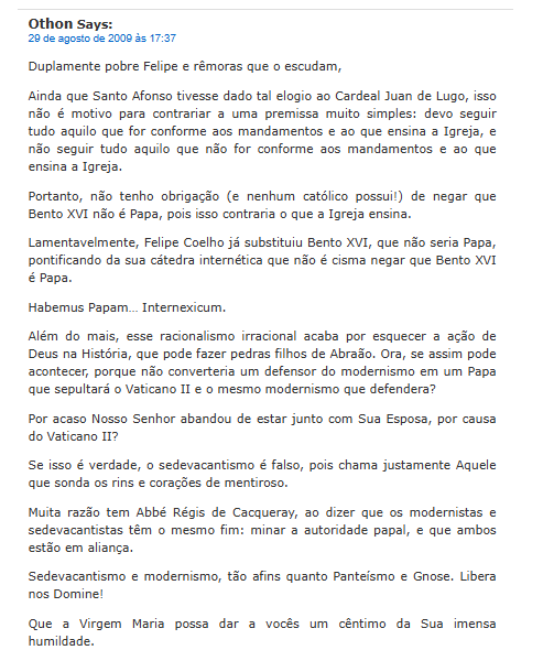 5 de dezembro de 2009 às 16:55 Prezado Othon Campos, da Montfort, Salve Maria! Hesitei muito em publicar este seu último comentário péssimo, mas por fim resolvi lhe responder, pois já o tive como amigo e tenho esperança de, quem sabe, ajudá-lo um pouco a ver melhor nessas questões, bem como para a edificação dos demais. Pois há muitos erros gravíssimos embutidos no que você diz, que tentarei explicitar a seguir. Para facilitar, dividirei-os em breves itens. Após o insulto de abertura – ao qual ainda voltarei, pois faz injustiça a meus amigos –, você começa com a seguinte enormidade: “Ainda que Santo Afonso tivesse dado tal elogio ao Cardeal Juan de Lugo, isso não é motivo para contrariar… os mandamentos e [o] que ensina a Igreja.” (Othon Campos/Montfort). Há tantos erros implícitos nesse breve trecho, que mal sei por onde começar! Vejamos: 1. Um primeiro erro seu aí, Othon, é julgar que De Lugo (na citação que dele fiz e que você critica) estaria enunciando algum tipo de tese própria dele, quando, na verdade, ele está apenas ensinando uma doutrina bastante corriqueira em teologia. Se você tivesse tido a prudência (e os bons modos…) de ler o breve estudo indicado por meus amigos, que tiveram a caridade de parar para ajudá-lo e quem sabe impedir esta sua longa humilhação (rezemos que salutar) à qual você me obriga agora (mas perderam tempo e ainda receberam como gratidão o seu desprezo!), você teria visto ali também, Othon, por exemplo, a seguinte citação, juntamente com a do Cardeal De Lugo: “Não podem, afinal, ser contados entre os cismáticos aqueles que recusam obedecer ao Romano Pontífice por considerarem a pessoa dele digna de suspeita ou duvidosamente eleita…” (Wernz-Vidal, Ius Canonicum, vol. vii, n. 398). Ou seja, tanto os maiores teólogos quanto os maiores canonistas concordam nesse ponto, meu caro. E um bom católico não é de modo algum livre para ir contra o parecer deles. 2. Para você se dar conta ainda melhor do nível de ignorância subjacente à sua arrogância, saiba que mesmo não houvesse essa concordância dos teólogos e canonistas, que no entanto existe, ainda assim uma autoridade como a do Cardeal De Lugo já nos permitiria seguir a opinião dele sem peso na consciência, pois: “No obstante que no exijan por esto unos de otros algo más de lo que exige a todos la que es Maestra y Madre de todos, la Iglesia: pues en aquello, acerca de lo cual en las escuelas católicas suele discutirse unos poniéndose en una línea y otros en otra opuesta entre autores de la más reconocida solvencia, a nadie debe prohibírsele seguir aquella sentencia que le parezca la más verosímil” (PIO XI, cf. Denzinger 2192). E olhe que você poderia ter encontrado esta citação, que talvez lhe tivesse feito recuar antes de proferir seus disparates, facilmente neste mesmo blogue: bastaria clicar em “questões disputadas” na minha breve postagem acima, justamente a que você clicou para comentar… 3. O seu terceiro erro, também típico do meio de onde você vem, é julgar-se (“humildemente”) melhor intérprete dos ensinamentos e mandamentos da Santa Igreja do que os teólogos e doutores designados, aprovados e recomendados por nossa Mãe e Mestra, coisa que nem você nem seu professor jamais foram. Novamente, se você tivesse tido os bons modos (e a prudência… afinal, que tipo de tolo desfere um ataque antes de procurar conhecer nem que seja superficialmente as tropas adversárias?) de ler ao menos o estudo que indiquei, no roteiro acima, como “a tradução inaugural e, sob certo sentido, a principal deste blog”, teria visto os textos magisteriais, os exemplos da história e a sã doutrina teológica que respaldam esse modo de proceder, infelizmente tão negligenciado em meios tradicionalistas. Cito-lhe aqui apenas um passo; veja como a objeção parece tirada da sua própria boca, Othon, ou de quem você imita: “Objeções [à Autoridade dos Teólogos] e Respostas. (A-C: Pe. Schultes; D: Pe. Cekada) [...] E. *Interpretações Privadas [Livre-Exame] dos Pronunciamentos Magisteriais.* “Eu acho que os pronunciamentos infalíveis da Igreja são todos bem claros. Eu não preciso de ‘interpretações’ ou explicações de teólogos. Eu simplesmente entendo tudo literalmente.”