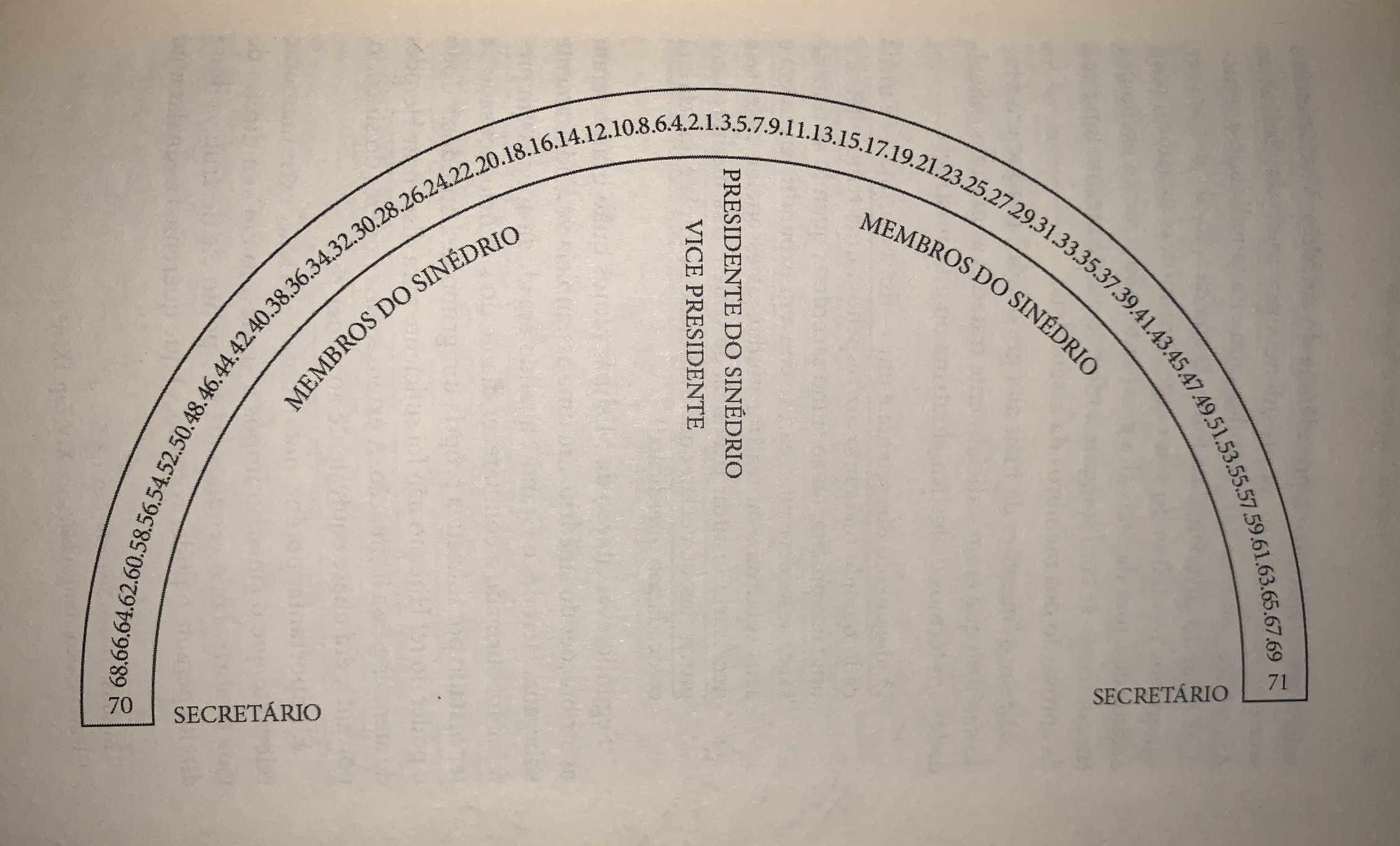 “O sinédrio era disposto em semicírculo. E em cada uma das duas extremidades desse semicírculo era colocado um secretário encarregado de apurar os votos; um daqueles que absolviam, e o outro daqueles que condenavam.”