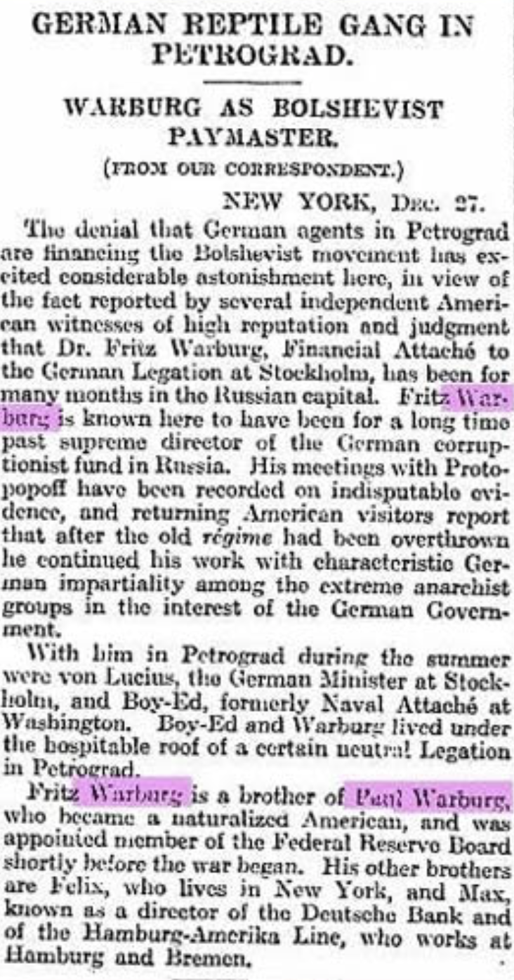 A negação de que agentes alemães em Petrogrado estejam financiando o movimento bolchevique causou considerável espanto aqui, tendo em vista o fato relatado por várias testemunhas americanas independentes, de alta reputação e discernimento, de que o Dr. Fritz Warburg, adido financeiro da legação alemã em Estocolmo, esteve por muitos meses na capital russa. Fritz Warburg é conhecido aqui por ter sido, durante muito tempo, o diretor supremo do fundo alemão de corrupção na Rússia. Seus encontros com Protopopoff foram registrados com evidências indiscutíveis, e visitantes americanos que regressaram relatam que, após a derrubada do antigo regime, ele continuou seu trabalho, com a característica imparcialidade alemã, entre os grupos anarquistas radicais, no interesse do governo alemão.