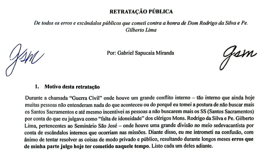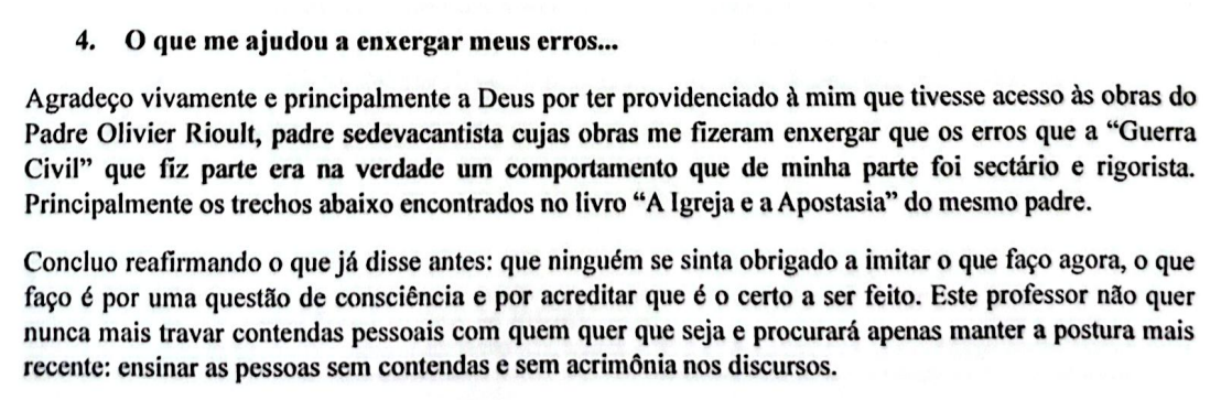 Há quem suspeite que uma infiltração sedevacantista está acontecendo na Resistência brasileira. Tudo indica que essas suspeitas são reais. Porém, não seremos guiados por especulações e prosseguiremos, ao contrário, ao fato concreto. A verdade é esta: Padre Olivier Rioult é sedevacantista. Desde quando o reverendo saiu da Resistência pela questão da missa una cum, é de conhecimento público e notório que o Padre Rioult não se submente aos falsos papas conciliares. Se há alguém que duvide dessas afirmações, convidamos à leitura da retratação de 26 de junho de 2025 que confirma que o Padre Rioult, autor do livro A Igreja e a Apostasia, é sedevacantista.