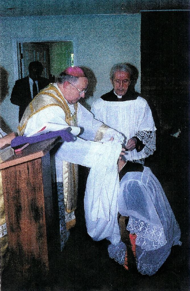 Surgiu, no entanto, uma questão. Uma das pessoas presentes pensou que Dom Lopez-Gastón não havia de fato tocado minha cabeça na parte essencial do rito. Eu, evidentemente, não posso testemunhar sobre isso, pois estava demasiado envolvido no processo de ordenação para verificar tal detalhe. Contudo, examinei recentemente as fotografias que foram tiradas e apresento duas delas como prova do contrário.