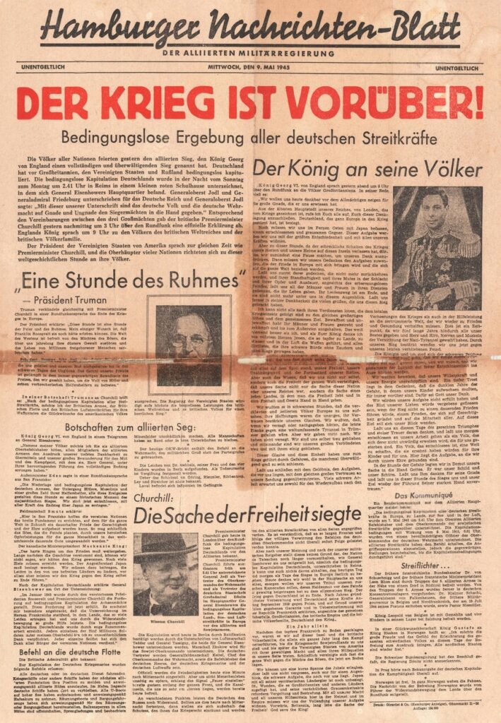Às vezes acontece de se guardar alguma coisa sem saber exatamente por que e para quê. Pois assim guardei por 64 anos e alguns meses o primeiro jornal pós-guerra, editado em 9 de maio de 1945 pelo novo governo militar aliado na cidade de Hamburgo, Alemanha. Hoje eu o saco dos meus arquivos, para mostrá-lo aos meus leitores com uma constatação que me parece de importância singular neste nosso esforço para saber o que realmente aconteceu naquela guerra fatídica. O documento original mede 38,5cm de largura por 56,8cm de altura. É constituído de uma única folha impressa de um lado só. Segundo informa, teve uma tiragem de 154.500 exemplares e foi distribuído gratuitamente. Ei-lo: